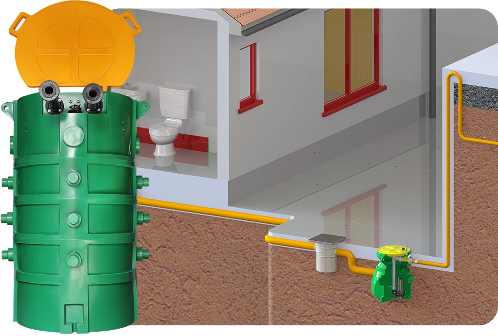 Sistema compacto e pronto que bombeia o esgoto com praticidade e eficiência.